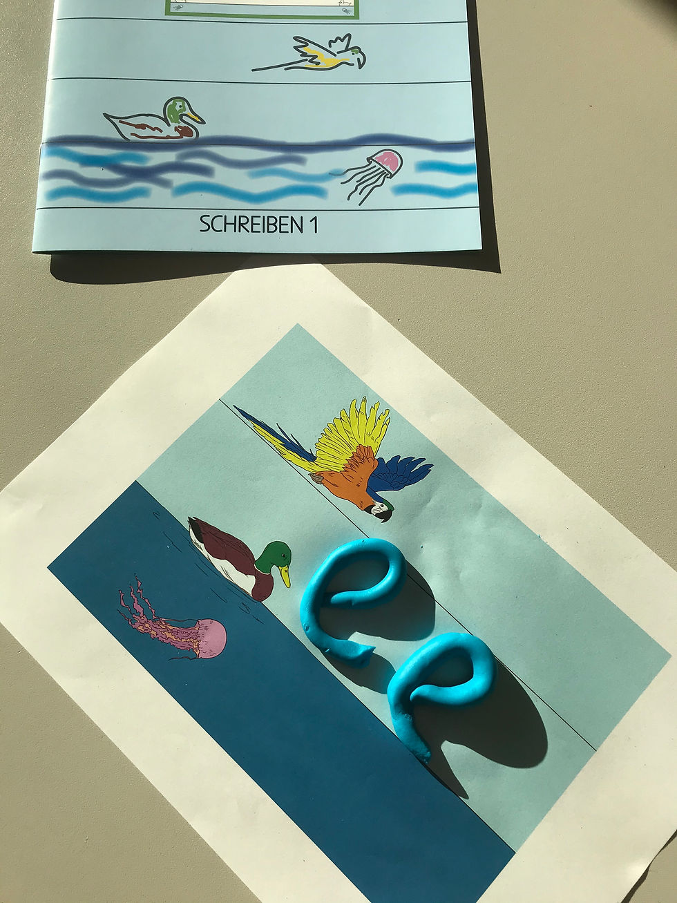 Bei der Schreibsicher-Lineatur vom AraVerlag schreiben die Kinder auf der Wasseroberfläche. Diese Schreiblinie ist mit der Darstellung einer schwimmenden Ente rasch ersichtlich. Unter Wasser ist die Qualle daheim, wohin gewisse Buchstaben, wie beispielsweise das "g", reicht. Andere Buchstaben reichen zum Ara am Himmel.